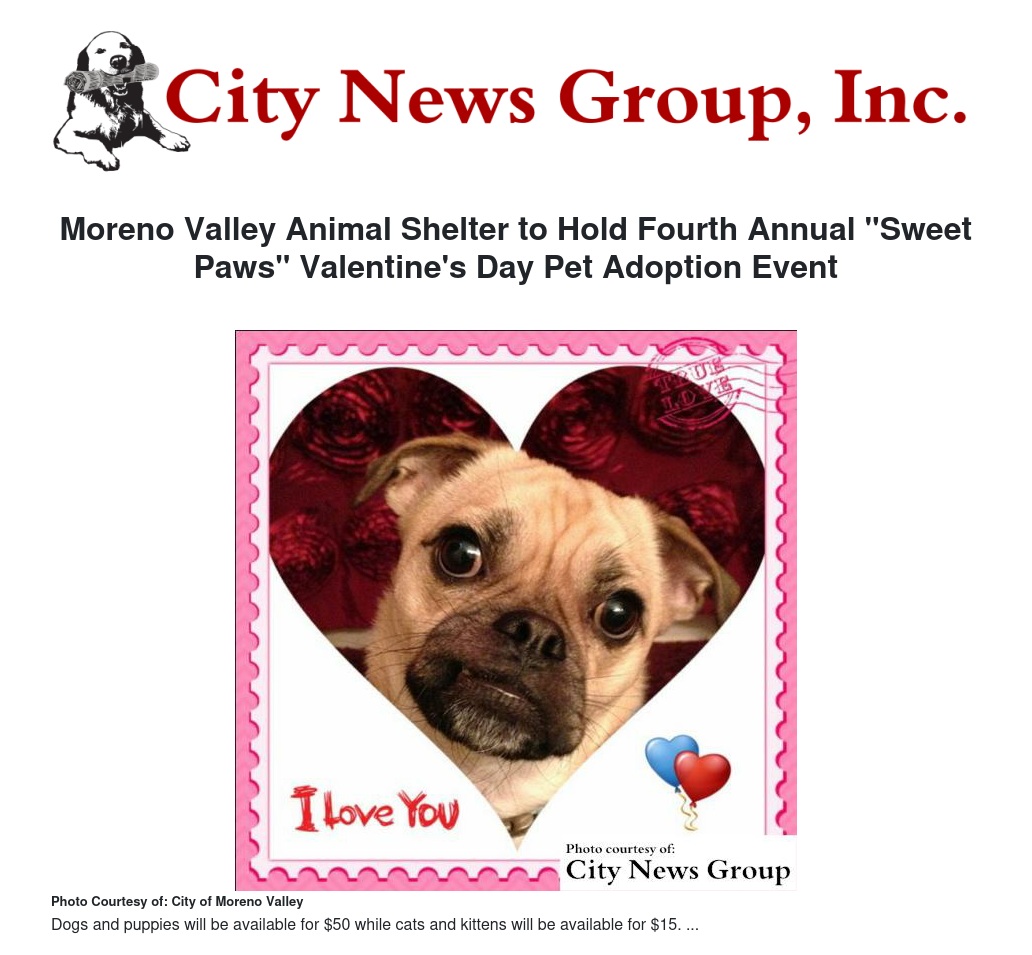 Moreno Valley Animal Shelter to Hold Fourth Annual "Sweet Paws" Valentine's Day Pet Adoption Event