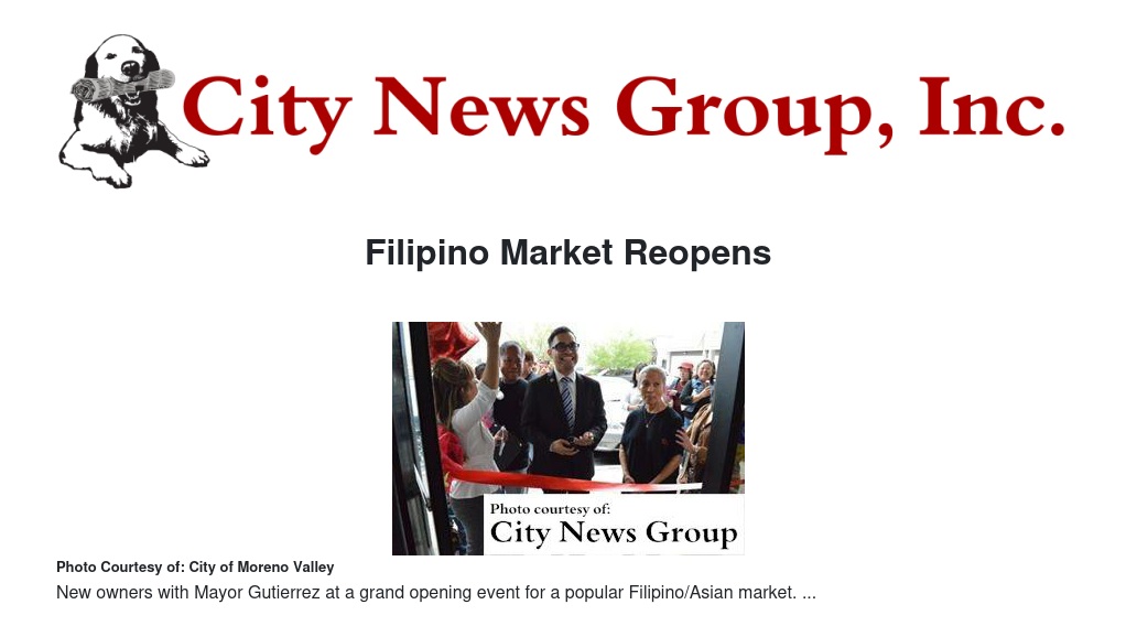 MORENO VALLEY >> A grand opening and ribbon cutting event was held last week for a popular Filipino/Asian market that has new owners. Manila Ranch Market is now owned and operated by a family who has lived in Moreno Valley for 24 years. Virgil and Cecille De Guzman are thrilled about their new adventure as business owners.
