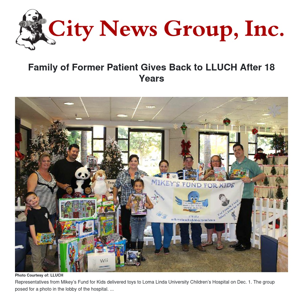 Christmas may be more than two weeks away but the patients at Loma Linda University Children’s Hospital (LLUCH) are already getting a feel for the holidays. Mikey’s Fund For Kids founder, Tina Carriera and others who helped raise funds, delivered a slew of gifts to the hospital on Dec. 1.