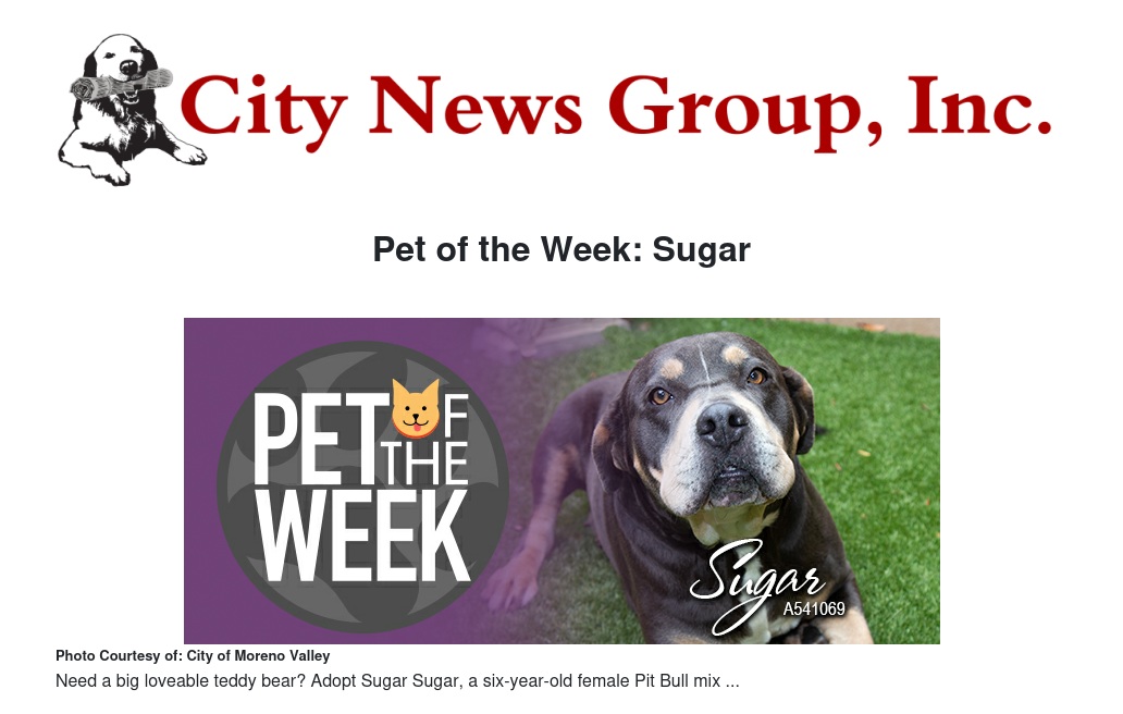 If you would like to make Sugar or any pet from the Moreno Valley Animal Shelter part of your family, please contact the Moreno Valley Animal Shelter at 951.413.3790 or visit moval.org/pets.