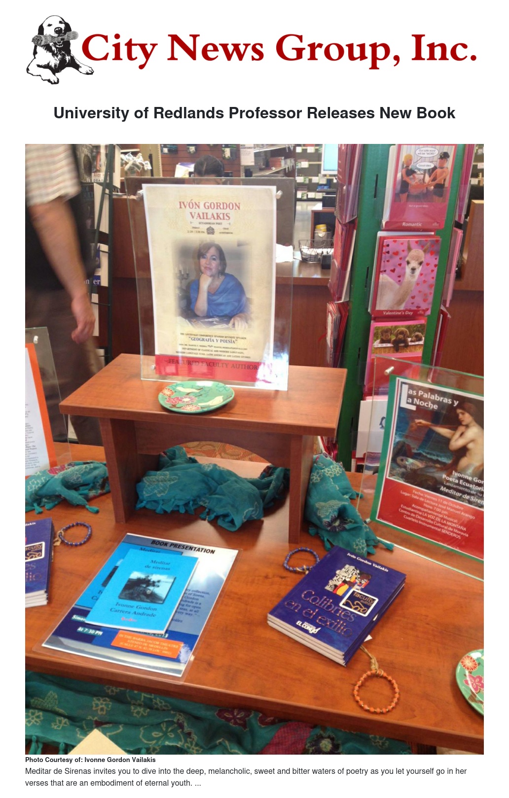Gordon Vailakis will have a book signing for her book Meditar de Sirenas on March 22, 2014 from 6 to 8:30 p.m. at the children’s bookstore the Frugal Frigate, located at 9 N 6th Street in Redlands.