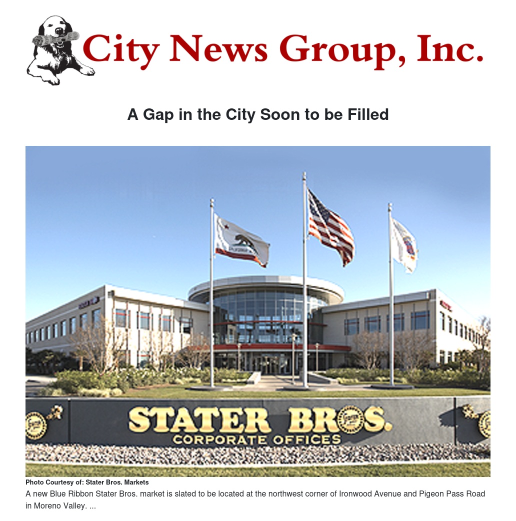 It was recently announced that Moreno Valley will welcome Stater Bros. to the northwest corner of Ironwood Avenue and Pigeon Pass Road.