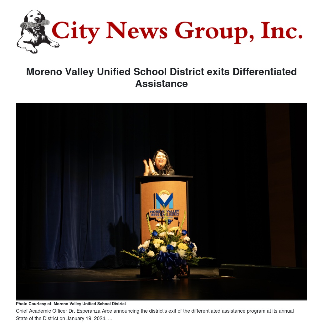 Moreno Valley, Calif. - The Moreno Valley Unified School District was recently recognized by the Riverside County Office of Education at its annual State of Education today for its progress in academic achievement, resulting in exiting the differentiated assistance program.