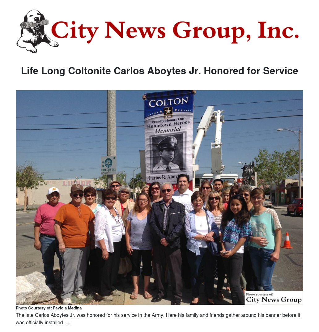 The late Carlos Aboytes Jr. was honored with a military banner in March of 2015 by his family, friends, and the City of Colton.