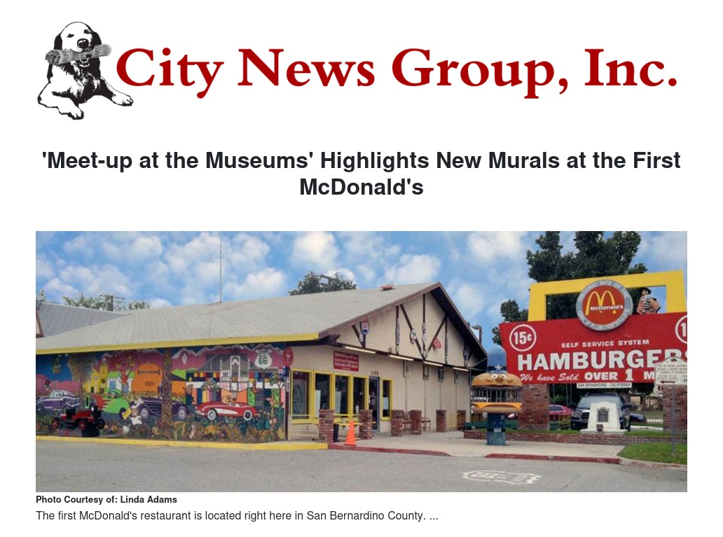 Sunday April 27, from 10 a.m. to 5 p.m., the public is invited to see the progress on the two murals being painted on the outside of the museum which sits on the historic spot of the original McDonald’s Restaurant. This first “Meet-Up at the Museums” was inspired by veteran motorcyclist Paul Busser from San Diego County. His friends have invited bikers from all over the area to come out and enjoy the Inland Empire Military Museum next door to The McDonald’s Museum. Music, models and the muralists will be on hand for this event at 1398 N. E. Street in San Bernardino.