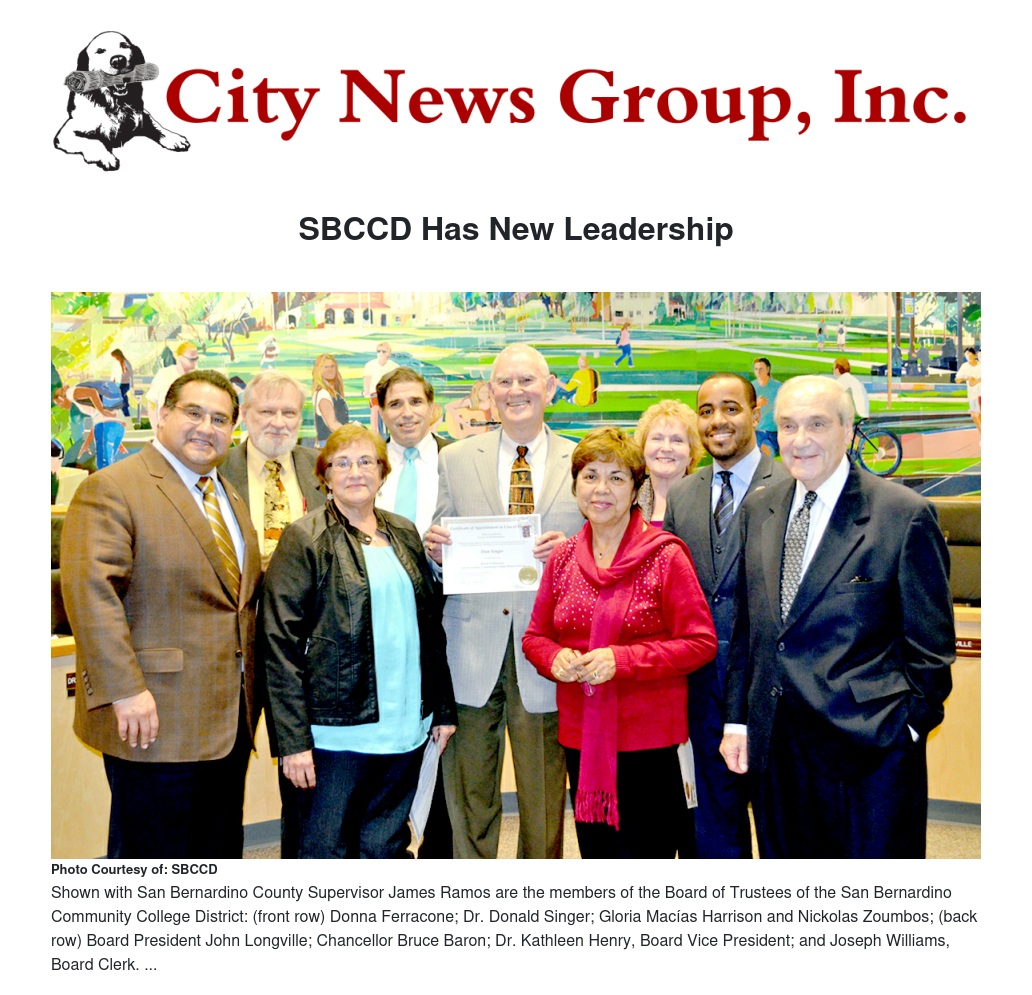 The San Bernardino Community College District (SBCCD) this month re-installed Board Members Donna Ferracone and Dr. Donald L. Singer and installed new Board Member Joseph Williams. San Bernardino County Supervisor and former SBCCD Board President James Ramos administered the oath of office. The Board of Trustees members elected trustee John Longville to serve as board president, and Trustee Dr. Kathleen "Katy" Henry as vice president and Trustee Joseph Williams as clerk. The Trustees will serve in those offices for two years.