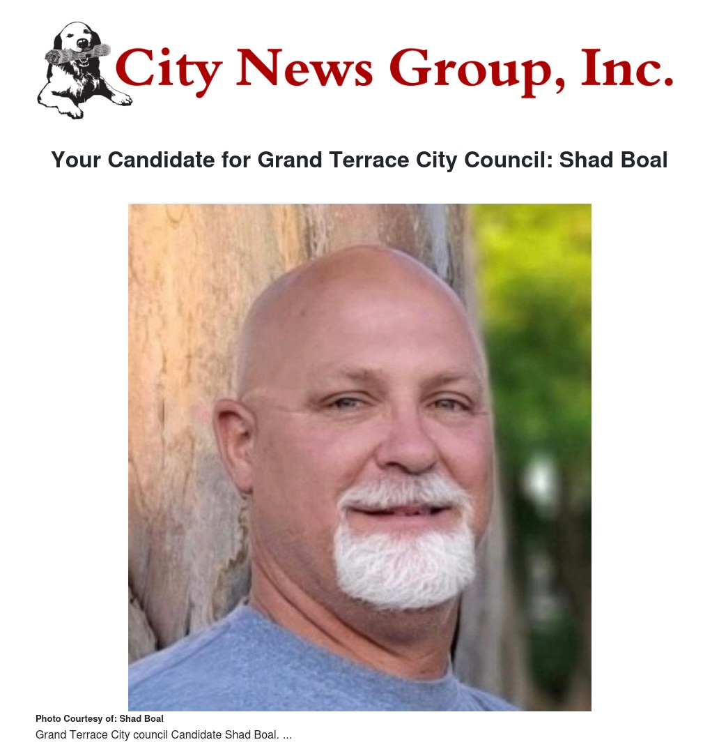 My name is Shad Boal, and I am a 21-year resident of the great city of Grand Terrace. I have had the opportunity to raise 4 kids in Grand Terrace who have attended Terrace View Elementary, Terrance Hills Middle School, and Grand Terrace High School. The experience of raising kids in a small, safe, family-friendly community has been my American Dream. I feel blessed to call myself a resident of Grand Terrace.