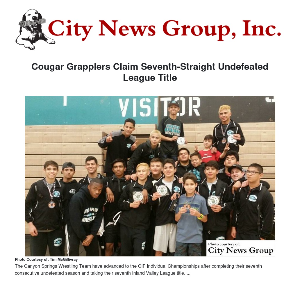 Canyon Springs wrestling belongs in that all-caps category, as their dominance on the mat must be close to record-setting. The Cougars have just completed their seventh consecutive undefeated season and clinched their seventh consecutive Inland Valley League title in the process.