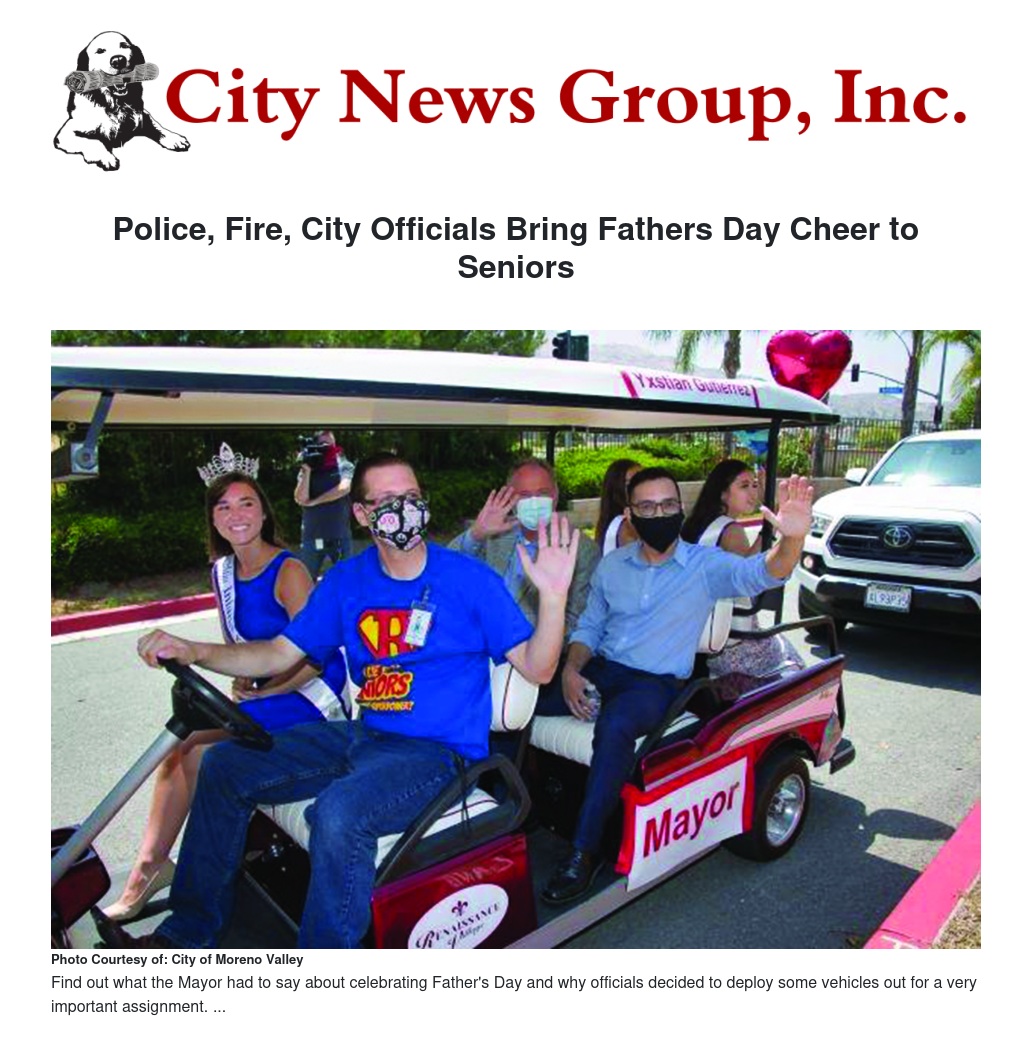Moreno Valley Police and Fire deployed some vehicles for a very important assignment this Fathers Day weekend: to bring best wishes to residents of Renaissance Village senior living facility.
