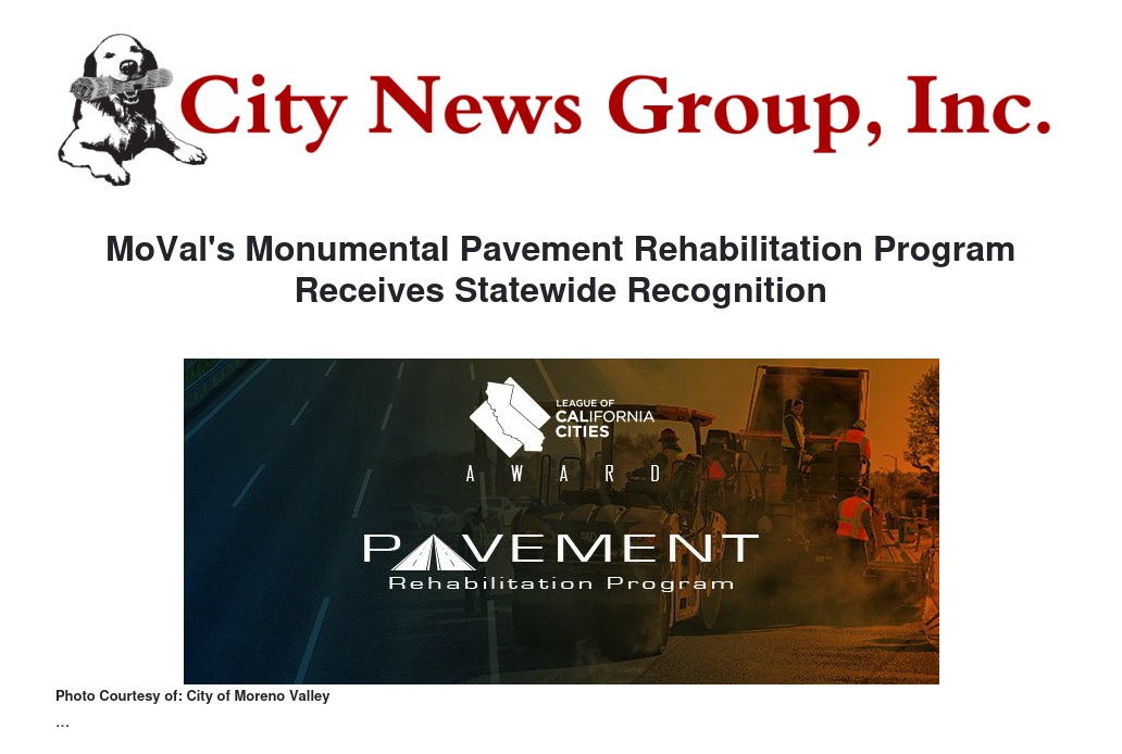The City of Moreno Valley has been awarded the Efficient and Sustainable Road Maintenance, Construction, and Reconstruction award by the League of California Cities' Local Streets and Roads Committee for its citywide Pavement Rehabilitation Program for Phases One and Two.