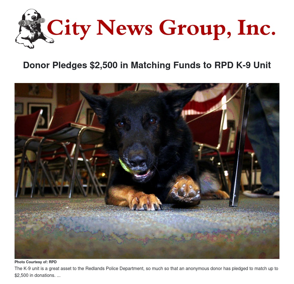Donations may be made out to the City of Redlands, attention Police Canine Fund, tax ID number 95-6000766. For further information, contact Patrick Estrada at (909) 647-7872.