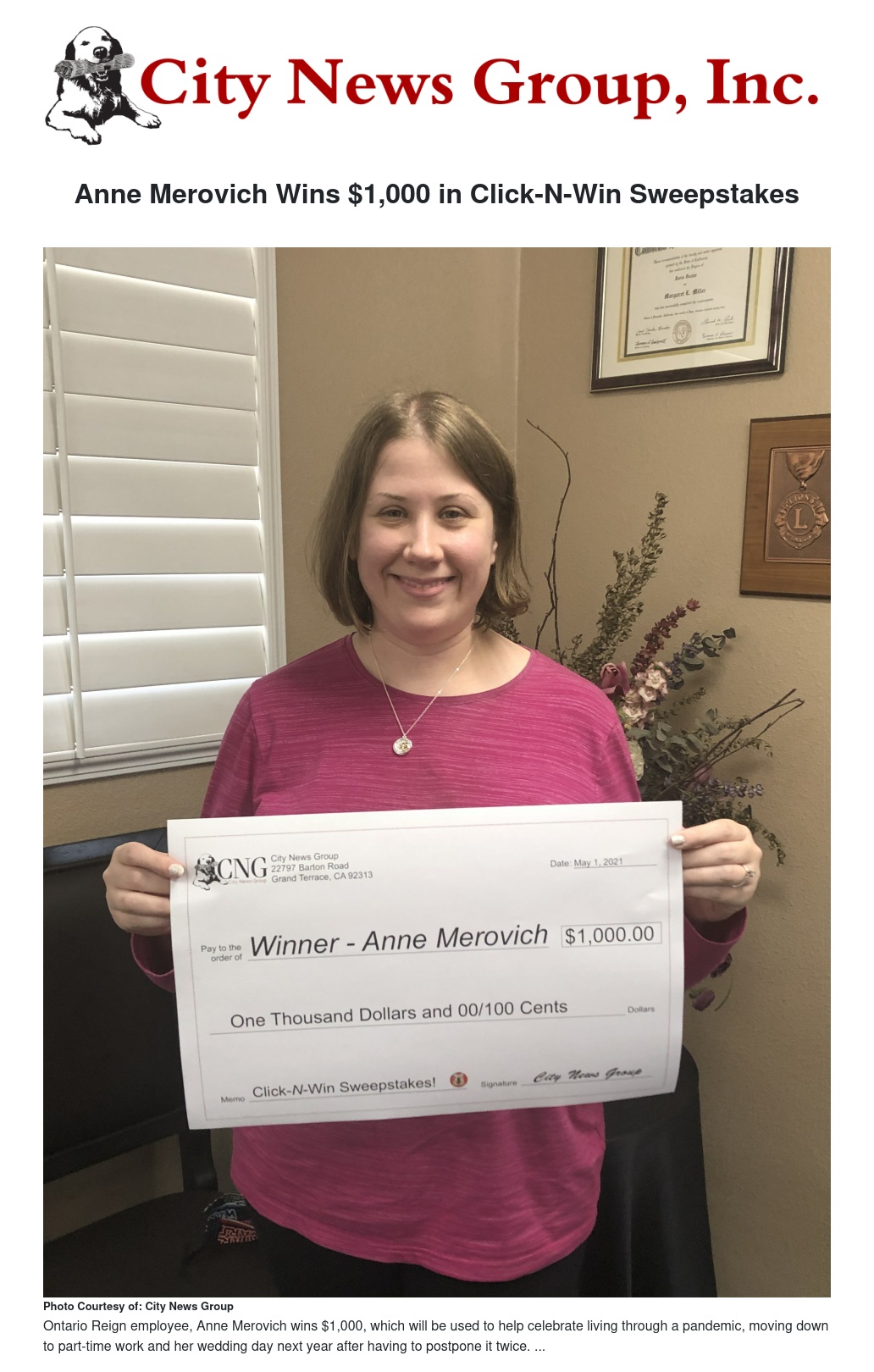 Anne Merovich Wins $1,000 in Click-N-Win Sweepstakes by Elena Macias - City News Group, Inc.