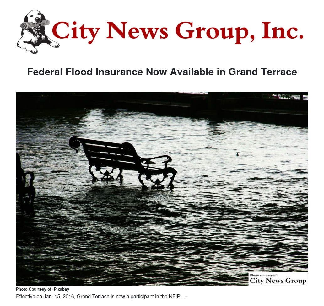 “This is important news for Grand Terrace residents.” said Mayor Darcy McNaboe. “Our residents are now eligible to purchase flood insurance at discounted rates. In many cases this can mean a significant savings from purchasing at the open market rates.”