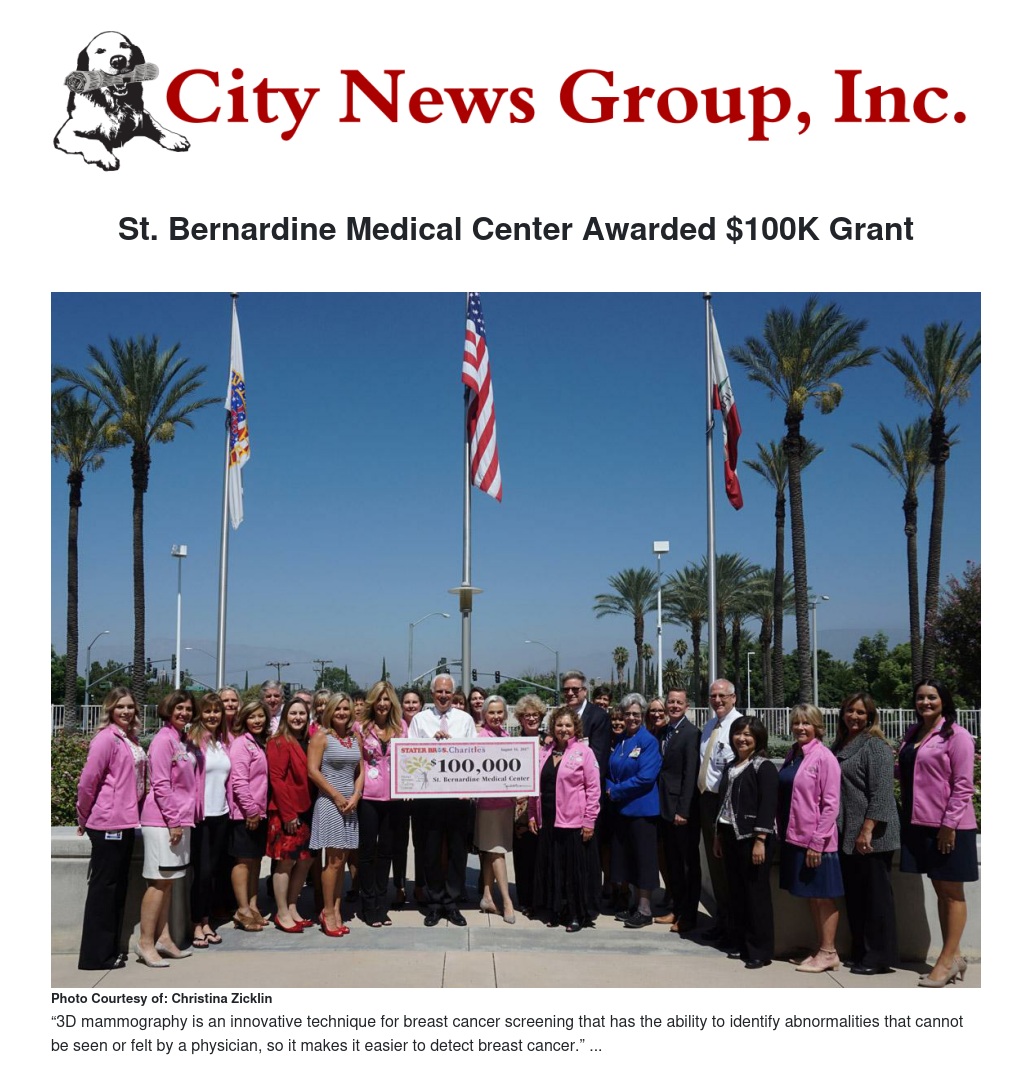 St. Bernardine Medical Center has received a $100K grant from Stater Bros. Charities and Inland Women Fighting Cancer to purchase state-of-the-art digital breast tomosynthesis technology.