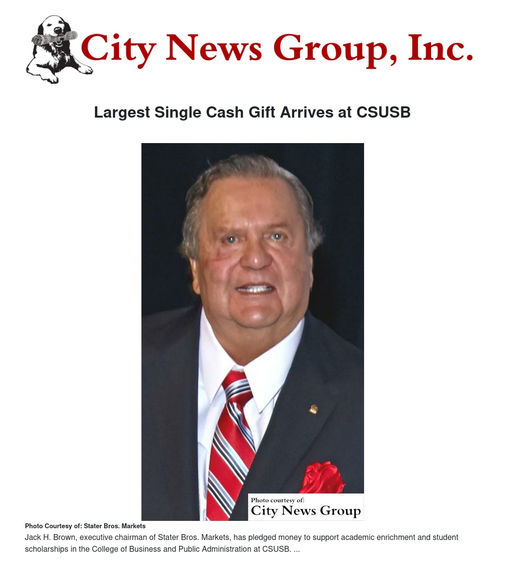 SAN BERNARDINO >> Jack H. Brown, executive chairman of Stater Bros. Markets, has pledged to make a personal record cash gift to the California State University, San Bernardino’s College of Business and Public Administration. It marks the largest single cash gift in university history, arriving as CSUSB culminates its 50th anniversary.