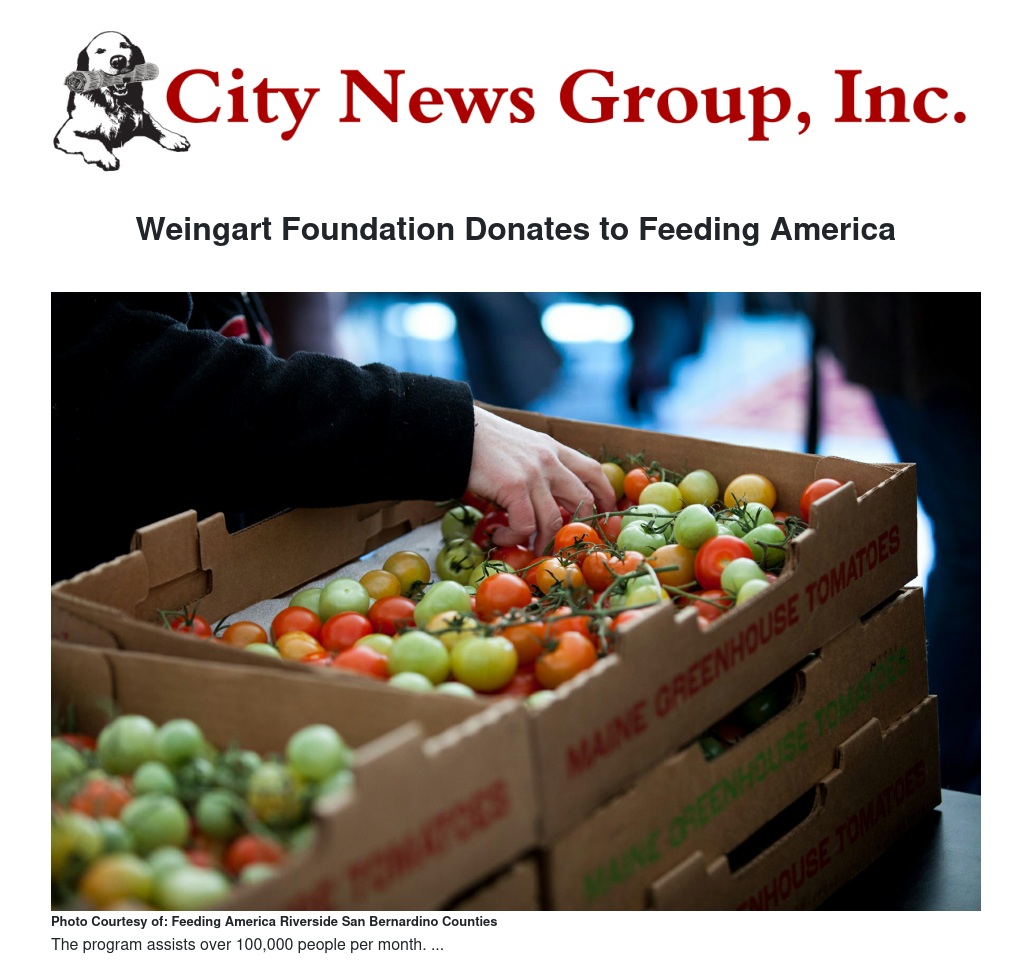 Feeding America Riverside | San Bernardino (FARSB) has received $150,000 from the Weingart Foundation of Los Angeles to address food insecurity in Riverside and San Bernardino Counties. The donation will be used for general operating support for the regional food bank to continue offering services and programs to over 100,000 people in need each month.