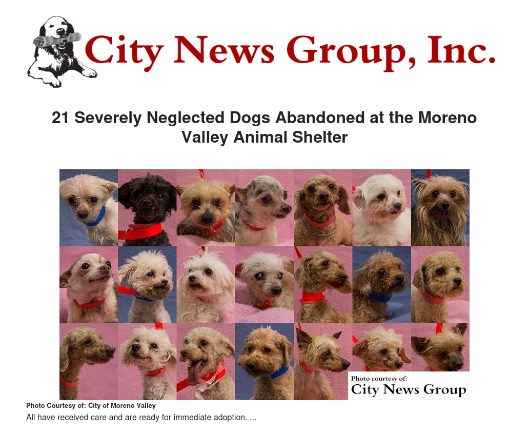"Although these dogs suffered greatly, they have made tremendous progress in response to receiving medical care and support provided by the staff at the Moreno Valley Animal Shelter. These dogs are all very sweet, loving and happy and they greet everyone they meet with a friendly tail wag. The dogs have been groomed and have put on weight since they arrived at the Shelter and are now available to be adopted into loving homes," Fries later said.