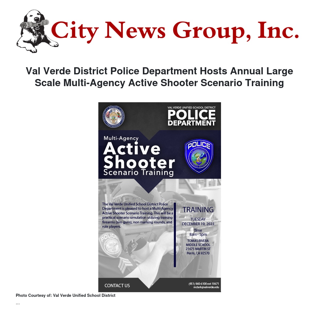 The Val Verde Unified School District Police Department will be hosting its annual large-scale active shooter training event. This training scenario will include numerous local law enforcement agencies from surrounding areas. We intend to make this the most realistic first 15-30 minutes of an active shooter response as we can make it. We will be using role players that will consist of adults and students with added visual and audio effects for realism. Teams will respond every hour throughout the training.