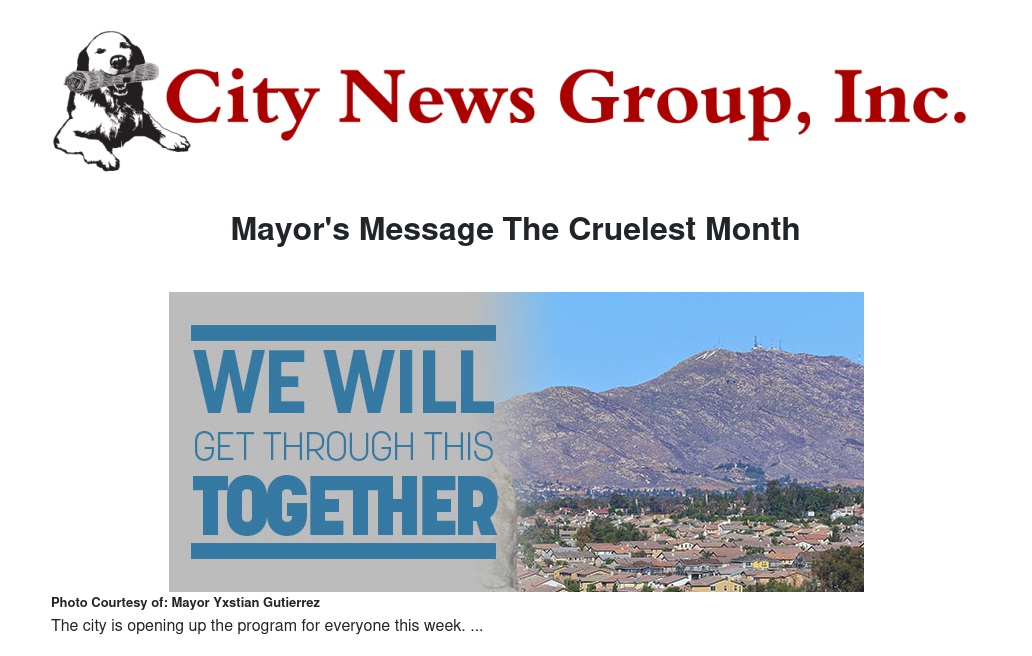 Mayor's Message The Cruelest Month by Mayor Yxstian Gutierrez - City News Group, Inc.