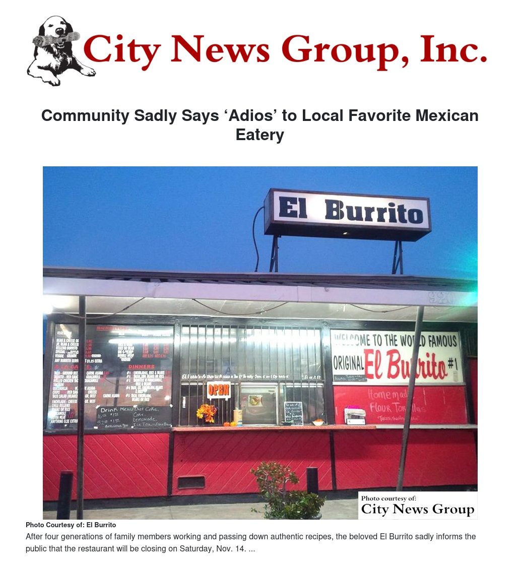 After four generations of family members working and passing down authentic recipes, the beloved El Burrito sadly informs the public that the restaurant will be closing on Saturday, Nov. 14.