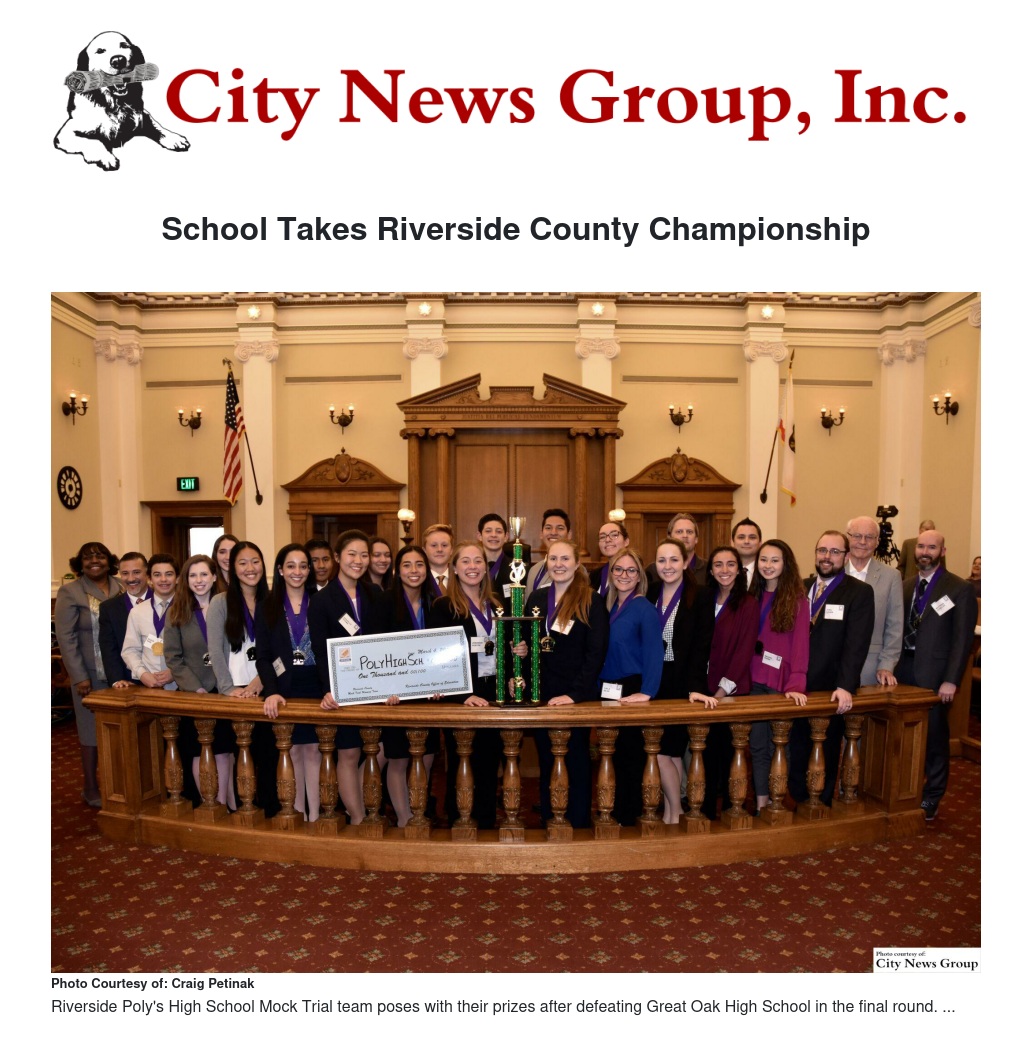 RIVERSIDE>> The verdict is in, and Poly High School from Riverside Unified School District has been named the overall champion at the 34th Annual Riverside County Mock Trial Competition after defeating Great Oak High School from Temecula Valley Unified School District in the finals on Saturday, March 4 at the Riverside Historic Courthouse.