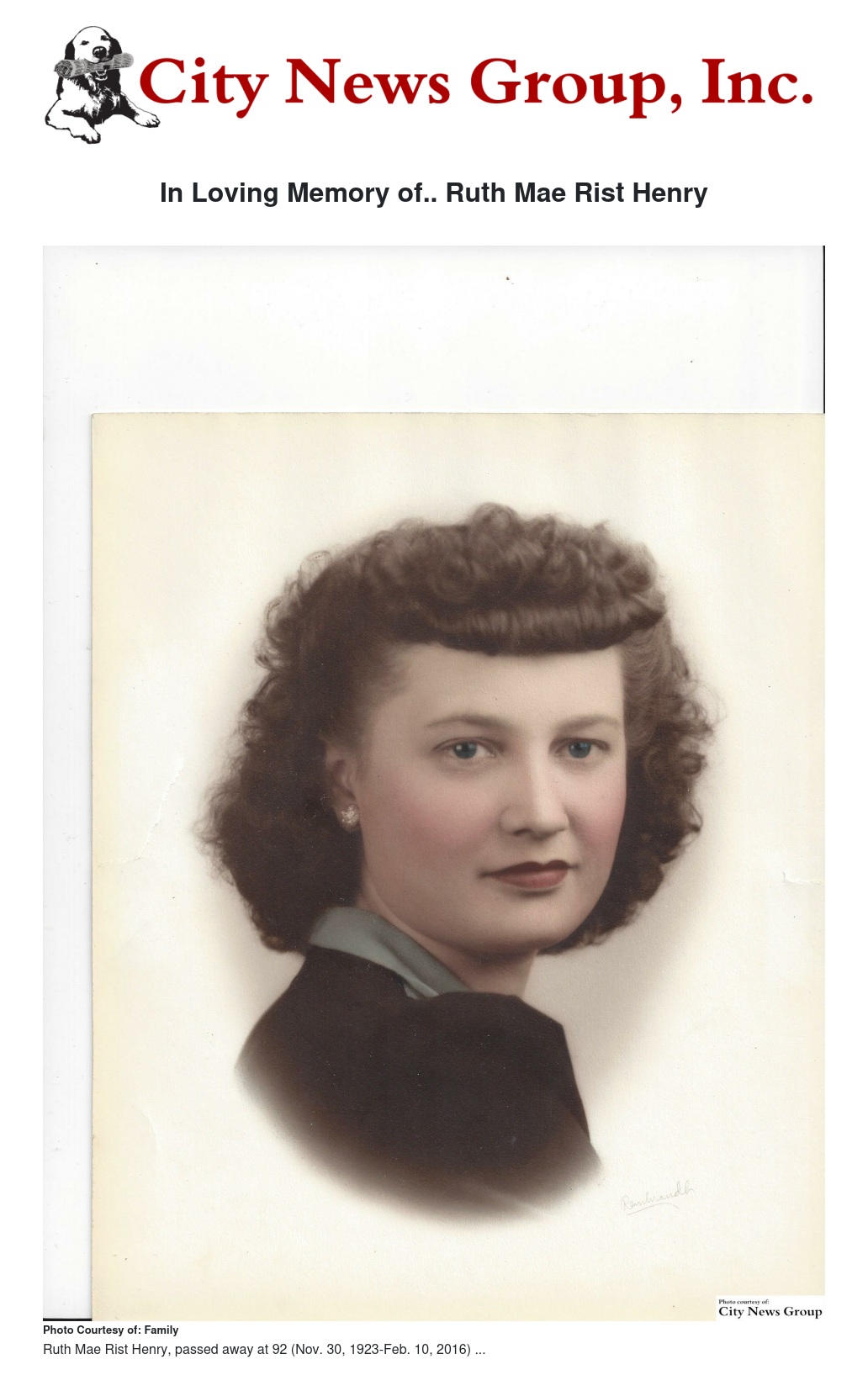 Ruth Mae Rist Henry, 92, of San Bernardino, passed away on Feb. 10, 2016. She was born in Ironton, Ohio on Nov. 30, 1923.