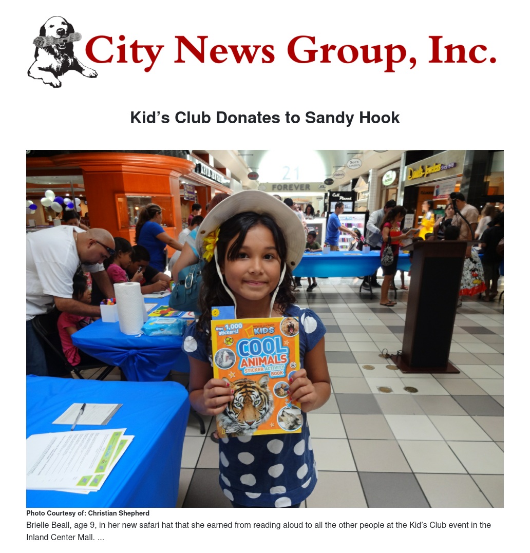 “We are proud to offer these books free to our Kid’s Club children and to donate to such worthwhile cause at the same time. These books are being given in honor of Sandy Hook. Celebrate your kids and celebrate summer, but never forget Sandy Hook,” stated Terri Relf, Senior Marketing Manager at the Inland Center Mall.