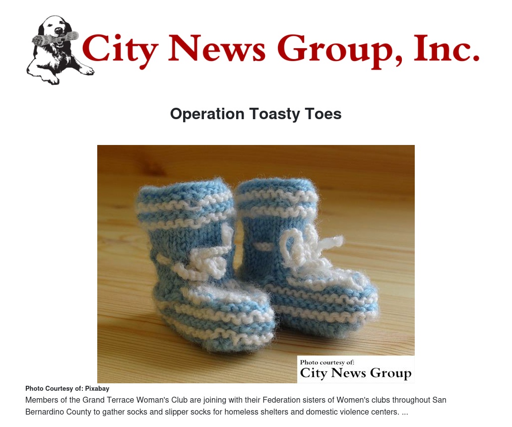 The Grand Terrace Woman’s Club will be participating in “Operation Toasty Toes” – a project of the GFWC/CFWC/San Bernardino District Women’s Clubs on Saturday, Nov. 7.