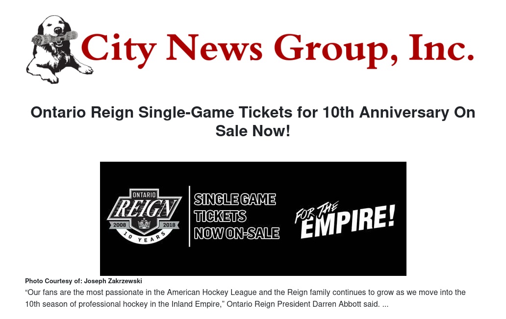 The Ontario Reign celebrate their 10th Anniversary season in October! Celebrate Opening Weekend on October 20-21 against the Bakersfield Condors at Citizens Business Bank Arena! Don't miss all of the exciting action as the Reign celebrate their historical season in the Inland Empire! For Reign season tickets, along with information on other ticket plans and group packages, call 909-941-PUCK (7825) and visit OntarioReign.com!