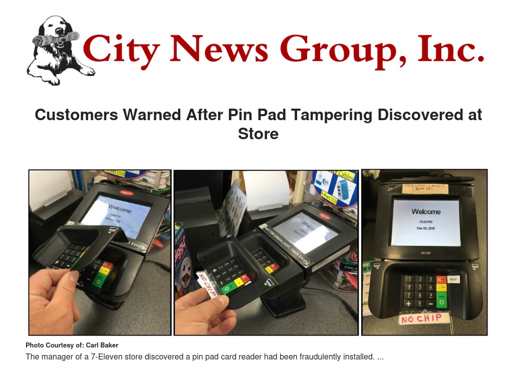 Redlands Police are warning consumers after the manager of a 7-Eleven store discovered a pin pad card reader had been fraudulently installed over the store’s legitimate pin pad.