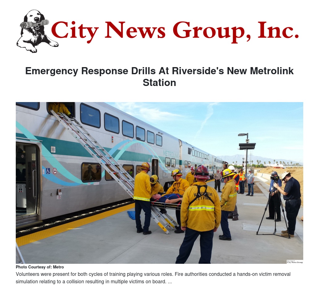 Metrolink, in partnership with the Riverside County Transportation Commission, the City of Riverside Fire Department, the Riverside County Sheriff's Department, the Riverside County Emergency Management Department, and the CAL FIRE/Riverside County Fire Department, held a multi-jurisdictional emergency preparedness drill.