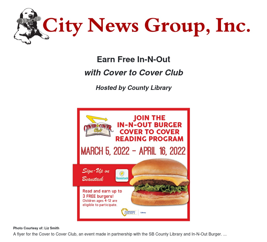 The San Bernardino County Library is partnering with In-N-Out Burger again this year to promote reading among children. The Cover to Cover program kicks off on Saturday, March 5 and will run through Saturday, April 16. This program will encourage students to read in all communities across the county.
