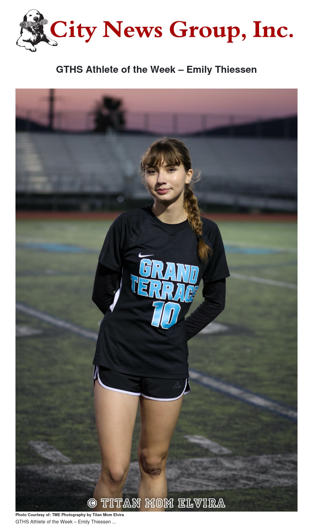 Emily also wants to thank her Grand Terrace Community Soccer Club coaches, Noris Rhodius and Richard Irwin. They taught her a lot about not only soccer, but teamwork, attitude, discipline, attention to detail, and how a team can work hard together and become a family.