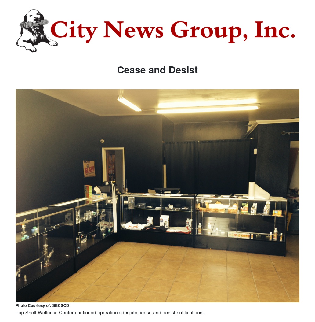 Recently, members of the Sheriff’s Marijuana Enforcement Team served a search warrant at the Top Shelf Wellness Center Marijuana Dispensary located in the unincorporated area of San Bernardino. The dispensary was being operated in violation of the San Bernardino County ordinance prohibiting marijuana dispensaries and continued to operate in defiance of cease and desist notifications.