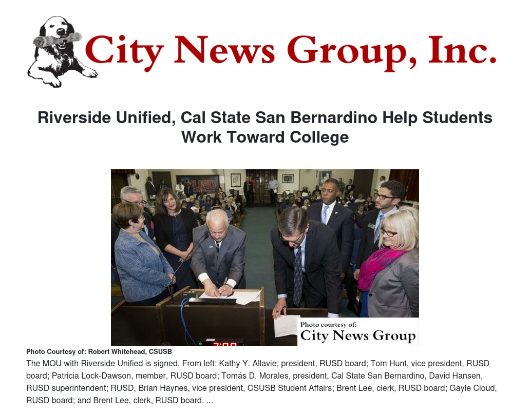 Riverside Unified School District joins 12 other school districts throughout Riverside and San Bernardino counties who have signed similar agreements with Cal State San Bernardino.