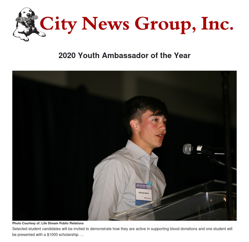 LifeStream Blood Bank is accepting online applications for its 2020 Youth Ambassador of the Year Award and accompanying $1,000 scholarship.