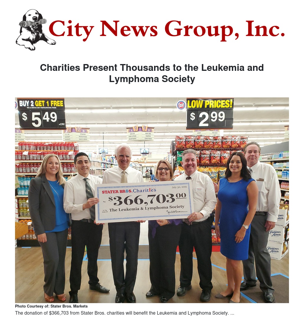 Stater Bros. Charities recently presented the Leukemia and Lymphoma Society (LLS) with a check in the amount of $366,703. The donation will benefit the Leukemia & Lymphoma Society's Susan Lang Pay-It-Forward Patient Travel Assistance program in Southern California, which helps blood cancer patients who have significant financial need and cannot afford travel expenses to doctor appointments or treatment centers. Funds for this donation were raised during an in-store fundraising campaign in which our valued customers and employees generously purchased $1 and $5 mobiles to contribute towards the program, bringing total fundraising dollars to $4.5 million since 2008.