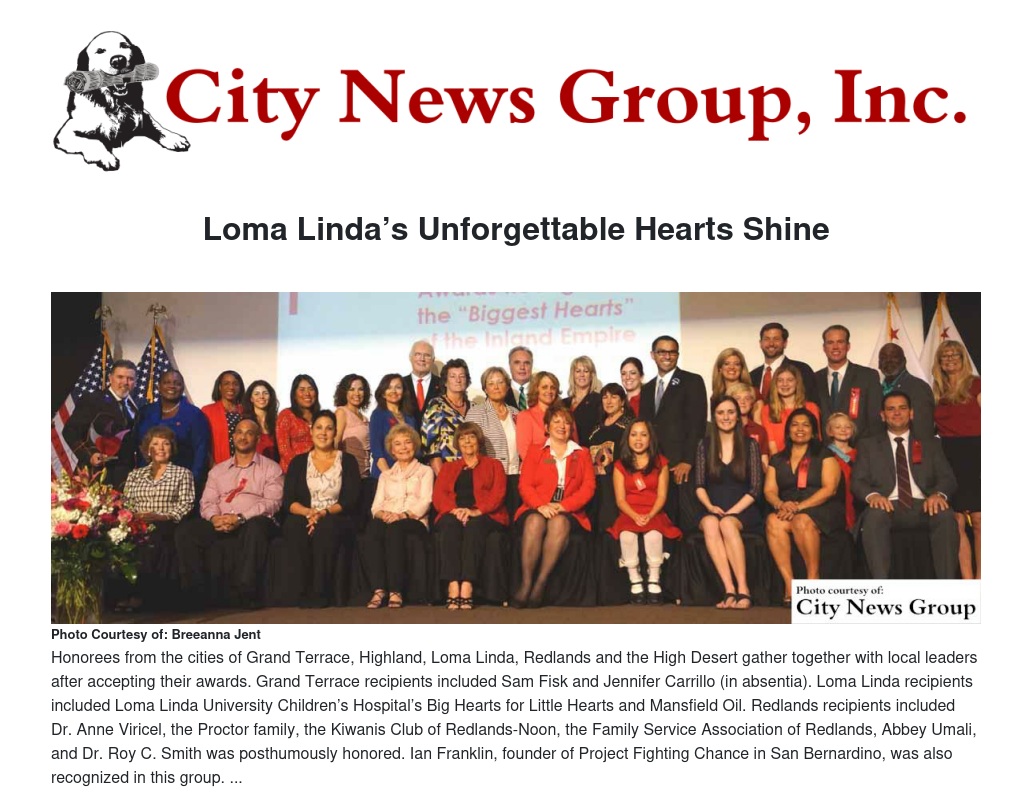 Loma Linda University Children’s Hospital’s Big Hearts for Little Hearts and Mansfield Oil were this year’s Loma Linda awardees, honored alongside others from the cities of Highland, Grand Terrace, Redlands and the High Desert.
