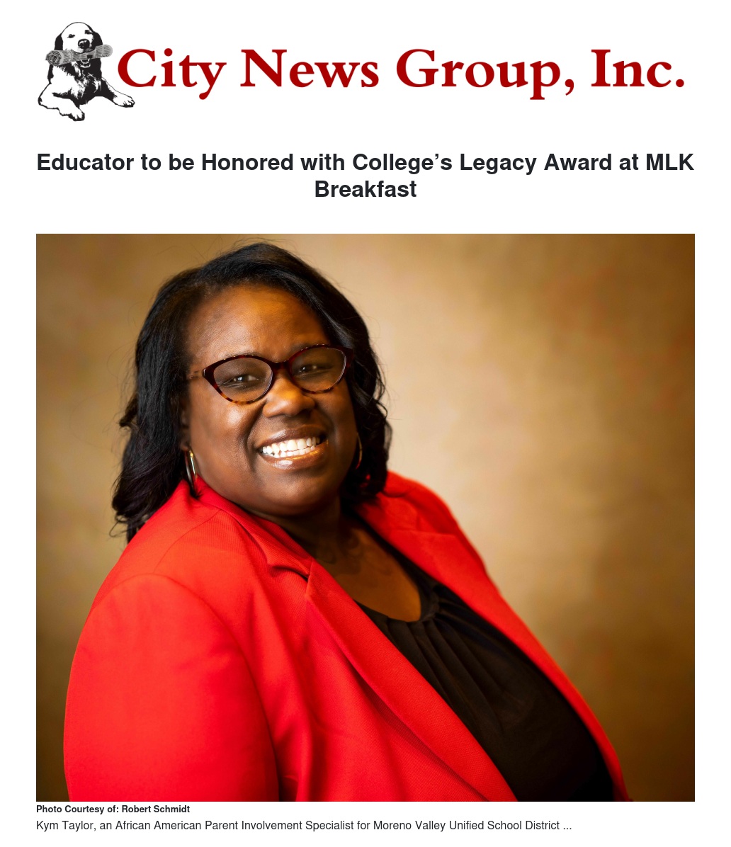 Kym Taylor, an African American Parent Involvement Specialist for Moreno Valley Unified School District, will be honored with the Moreno Valley College’s Legacy Award at the annual Martin Luther King, Jr. Scholarship Breakfast & Scholarship Ceremony.