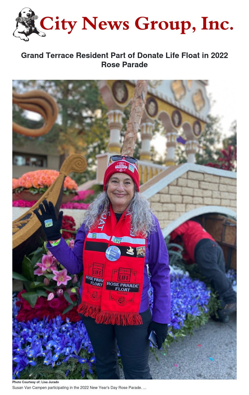 Grand Terrace resident Susan Van Campen was part of the 2022 Donate Life Float “Courage to Hope,” which won the Extraordinary award on the New Year’s Day Rose Parade on New Year’s Day.