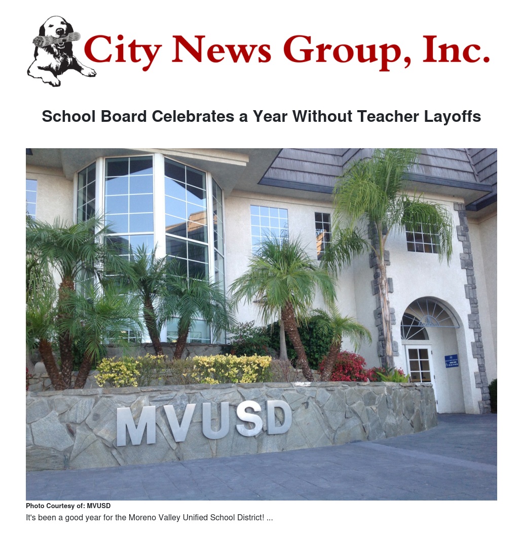 After seven years of annual budget cutting due to reduced state funding, Moreno Valley Unified School District (MVUSD) employees and School Board are celebrating the fact that no permanent certificated (teaching) employee is expected to lose work this year.