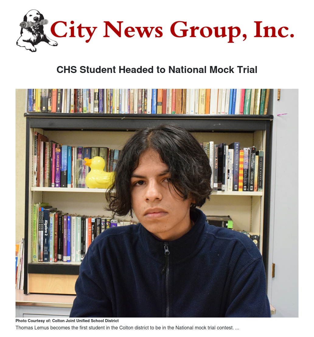 Colton High School junior Thomas Lemus has been chosen to represent the Colton Joint Unified School District, San Bernardino County, and the state of California at the National High School Mock Trial Competition, which takes place May 16-18 in Athens, Georgia. This is the first time a Colton Mock Trial team member has participated at the national level.