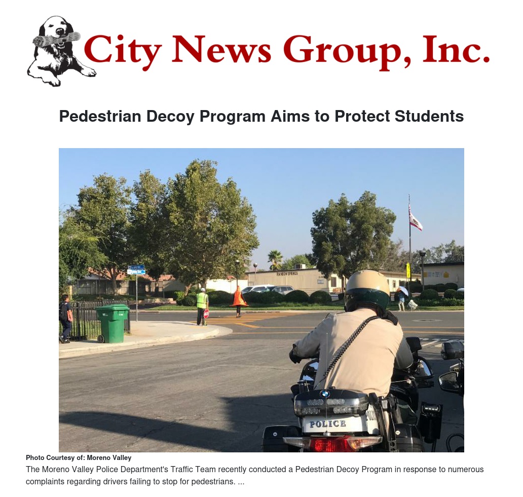 The Moreno Valley Police Department's Traffic Team recently conducted a Pedestrian Decoy Program in response to numerous complaints regarding drivers failing to stop for pedestrians in crosswalks and intersections near local schools.