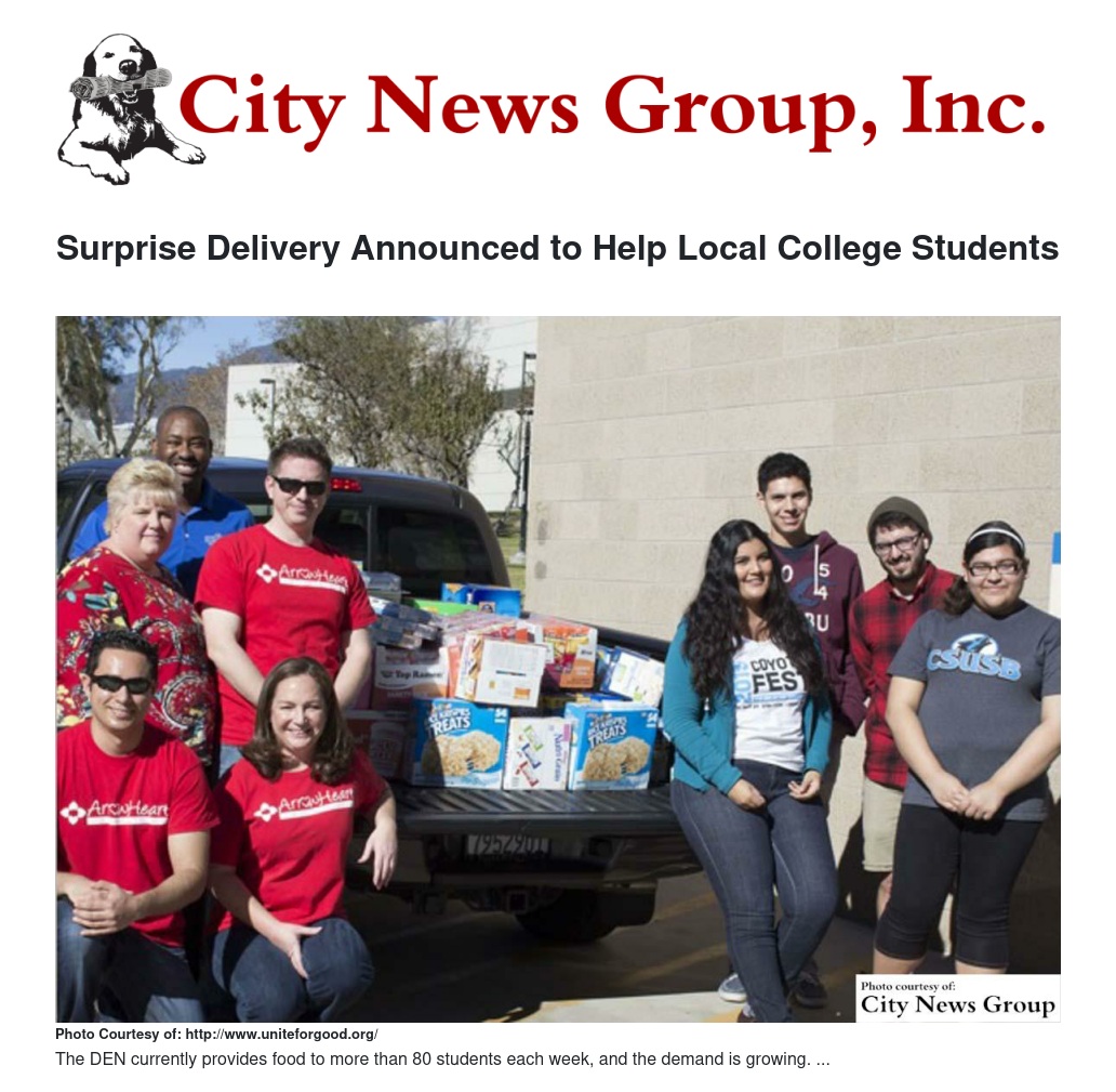 The team at Arrowhead Credit Union made a surprise donation by delivering a truck full of food to stock the shelves at The DEN (Delivering Emergency Nourishment), a new program at Cal State San Bernardino. The DEN is CSUSB’s own food pantry for the many students who regularly have to choose between hunger and paying for classes.