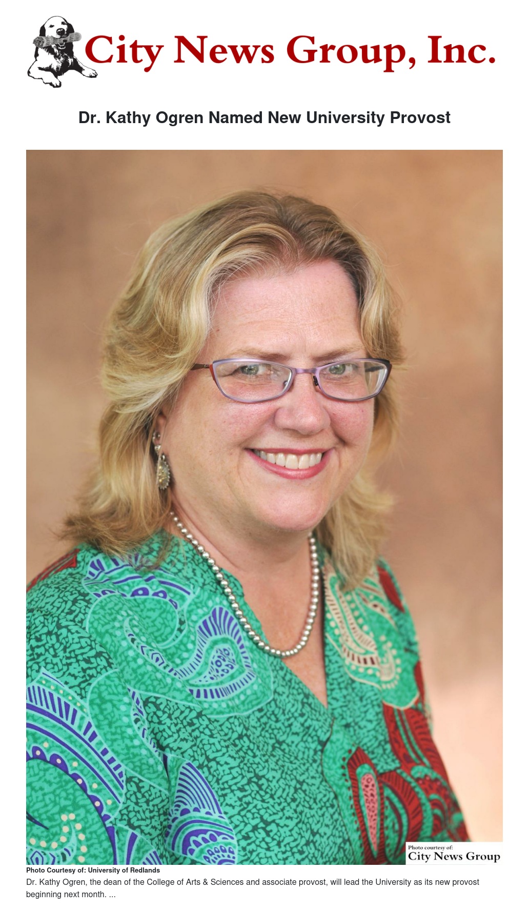 The University of Redlands has named Dr. Kathy Ogren, currently dean of the College of Arts & Sciences and associate provost, as the new provost of the University beginning June 1.