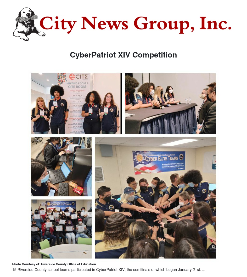 Many of the Cyber Academic Pathway students are also formidable competitors in the annual CyberPatriot competition. The Air Force Association's CyberPatriot Program was created to inspire K-12 students to pursue careers in cybersecurity or other STEM fields. Over 5,000 high school and middle school teams across the country took part in this year's CyberPatriot XIV that began in October 2021, including 15 Riverside County school teams. Four Cyber teams from Canyon Springs High School (CSHS) advanced to compete at the State level in December, and two of those teams are now headed to the CyberPatriot XIV Semifinals beginning January 21st.