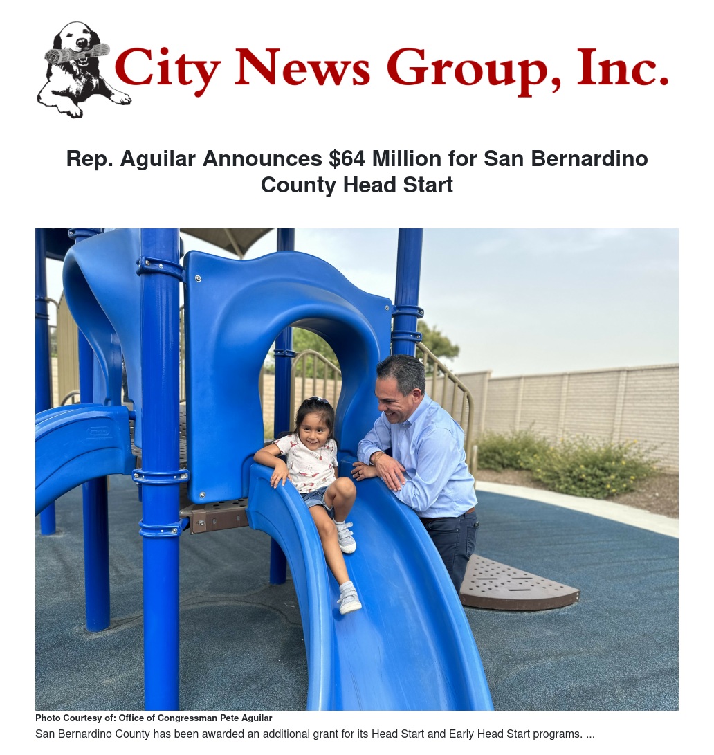 On August 10, Rep. Pete Aguilar announced a $64,533,842 grant for San Bernardino County Head Start and Early Head Start programs. In San Bernardino County, Head Start currently serves nearly 4,000 kids and their families.