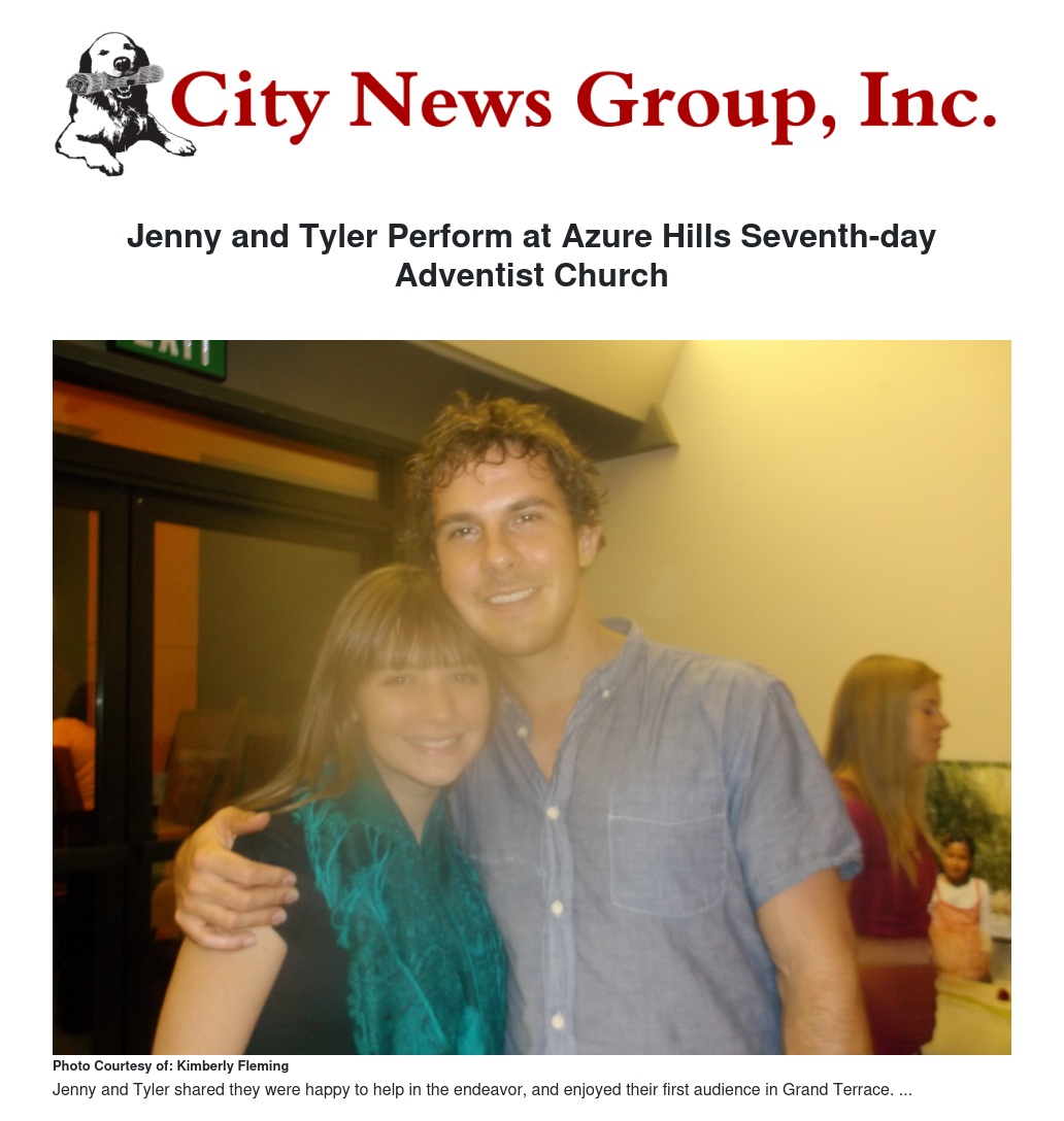 Jenny and Tyler traveled west and settled in Grand Terrace, where they performed for a Blue Mountain community audience at the Azure Hills Seventh-day Adventist Church.