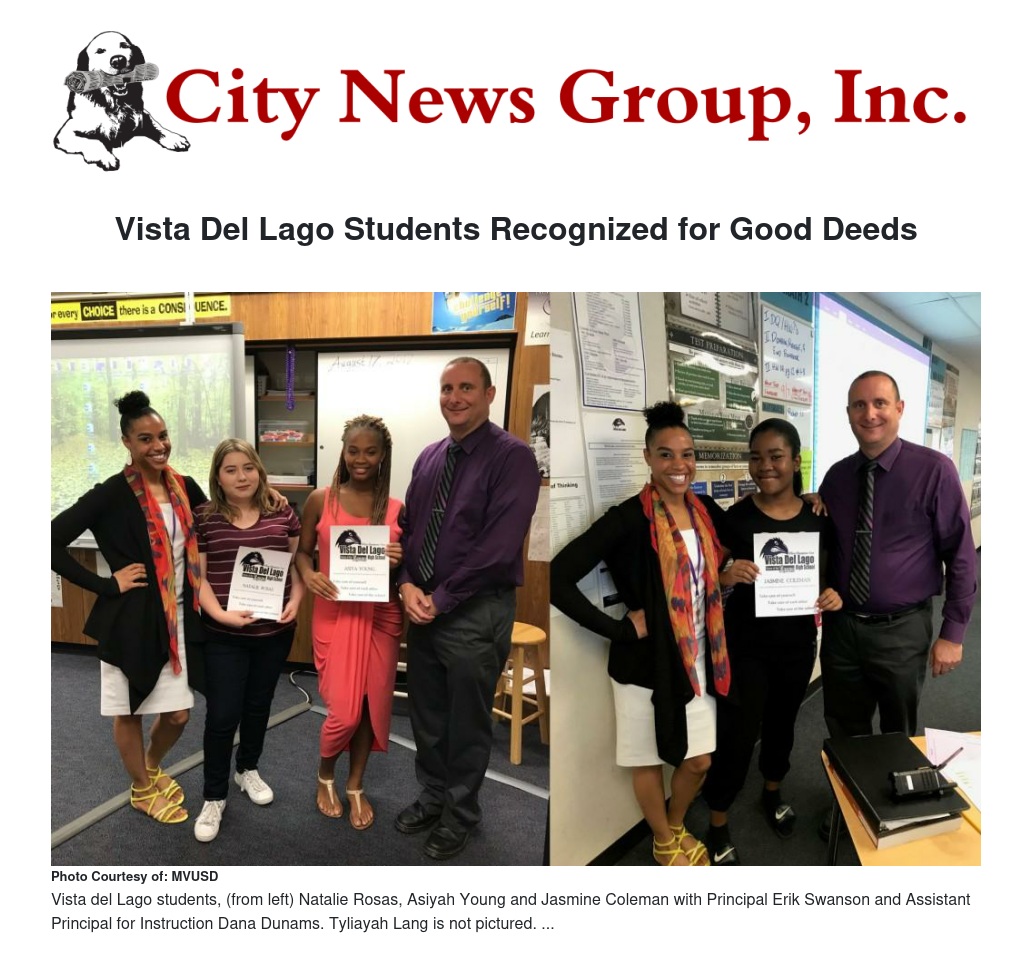 MORENO VALLEY>> Vista del Lago High School’s motto is “Take care of yourself, take care of each other, and take care of the school.” A few students were recognized for being an example of those words recently.