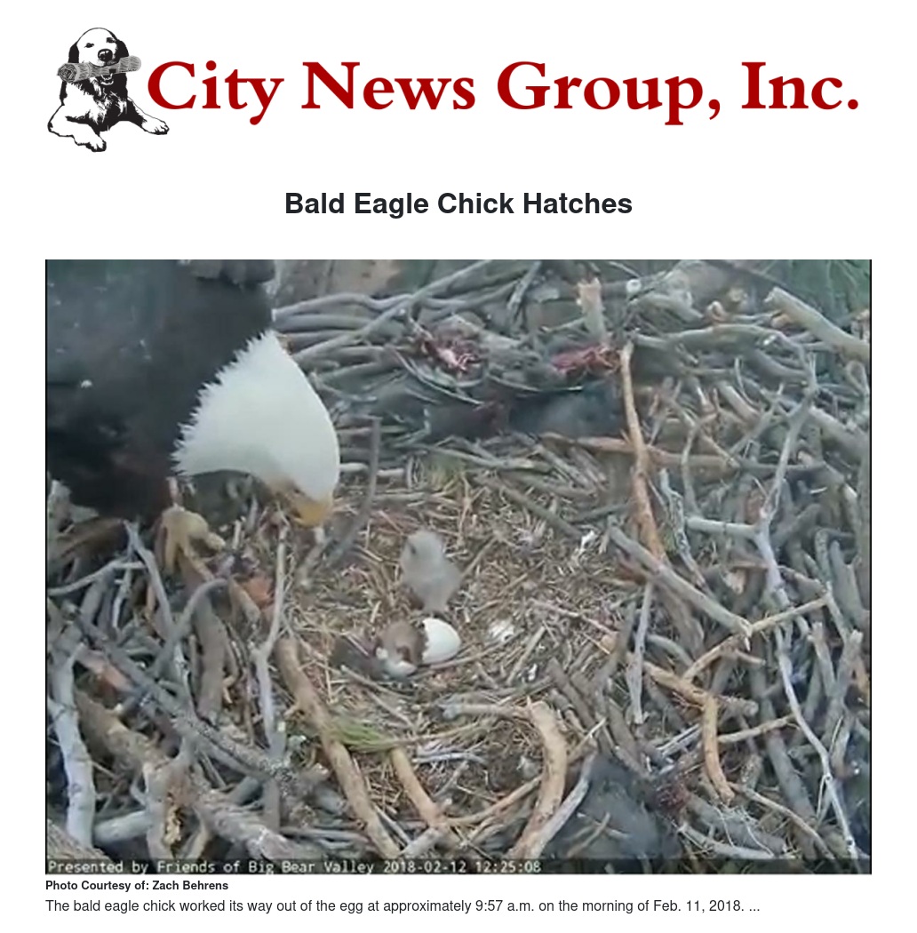 With all eyes glued to a live streaming “nest cam,” viewers from all over the country watched as a bald eagle chick worked its way out of the egg at approximately 9:57 a.m. on the morning of Feb. 11, 2018, at a nest in San Bernardino National Forest near Big Bear Lake, Calif. Two eggs were laid in early Jan. in the nest of a pair of eagles. The pair took turns on the nest during the 35 day incubation period, including through a snow storm. The second egg was laid three days later than the first and is expected to hatch within a few days.